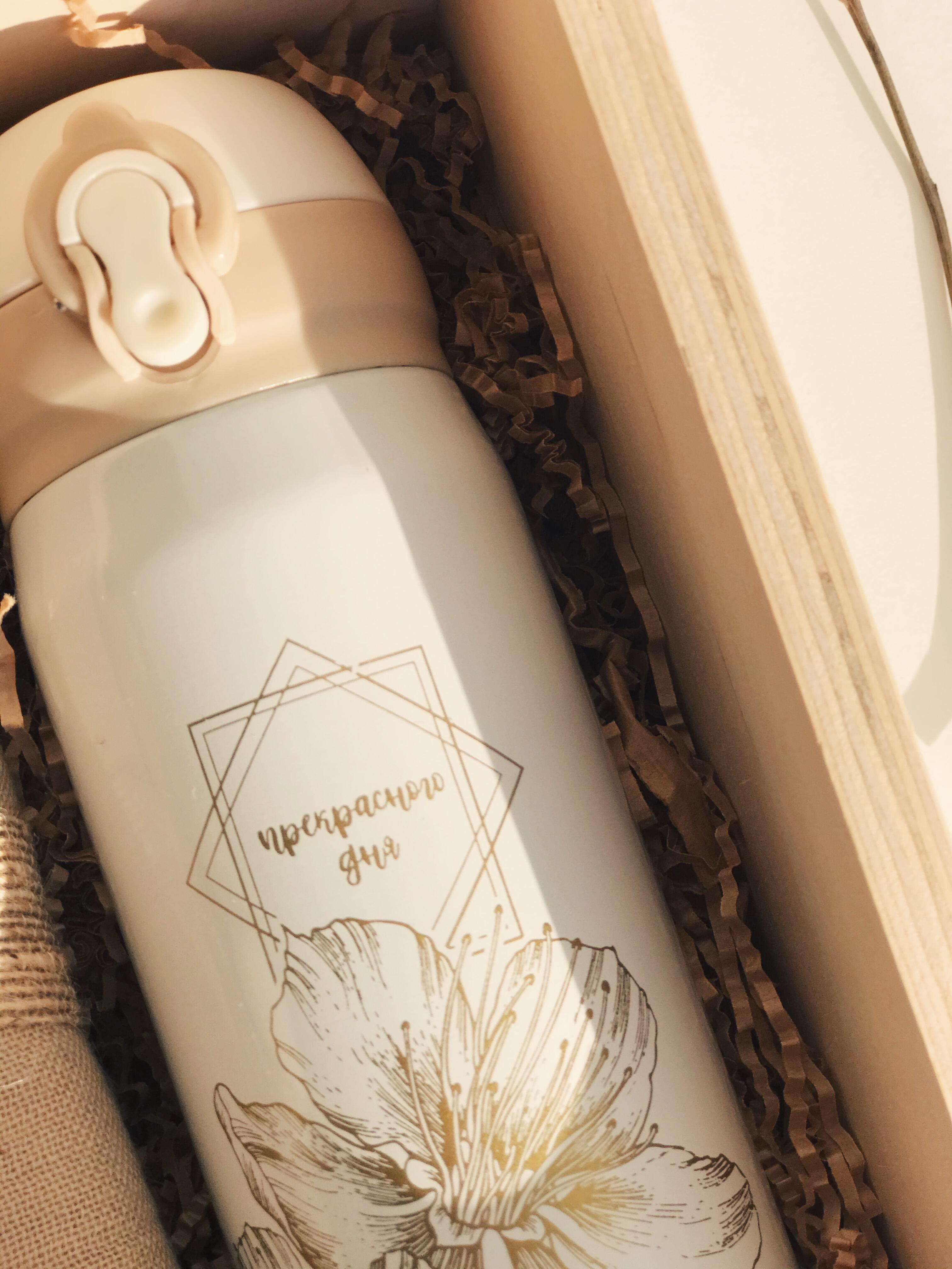 • термос с пожеланием «Прекрасного дня» (объём 350 мл., сохраняет тепло 8 часов, с удобной поилкой, чтобы пить прямо из него);
